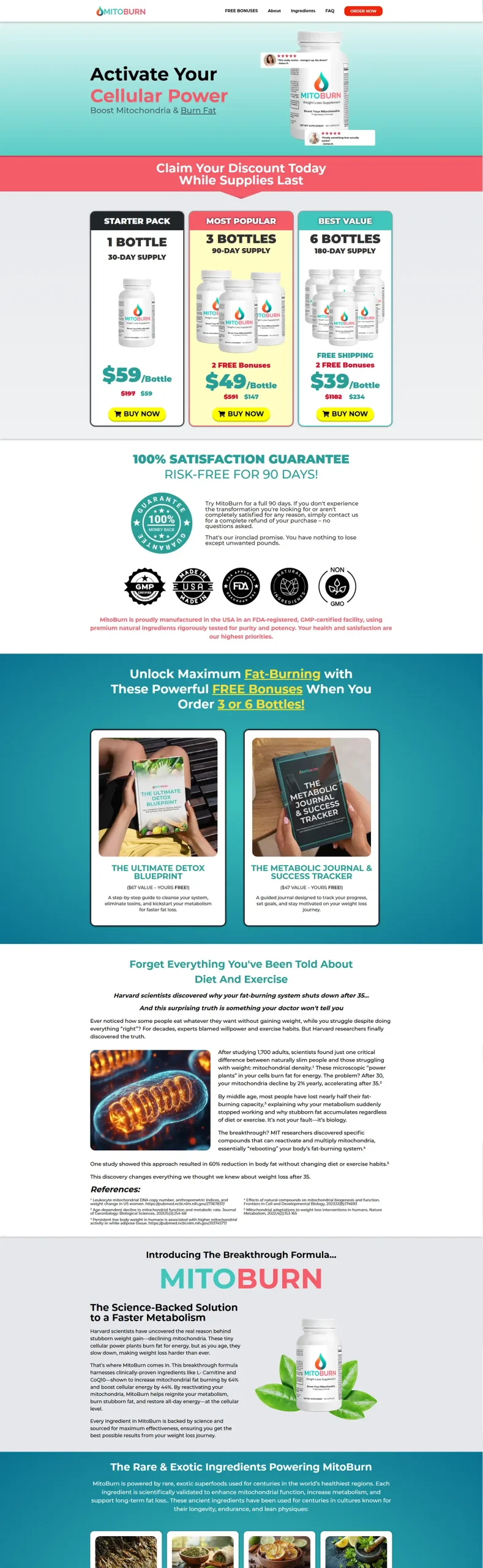 Design a bold, engaging landing page to introduce MitoBurn™ supplements, clearly communicate benefits, and drive conversions from health-conscious visitors.